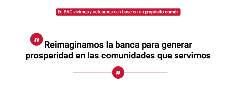 BAC quiere ser un banco que ofrece soluciones financieras de triple valor positivo. Esto significa que con la misma excelencia y rigurosidad que trabaja en maximizar el valor económico, también lo hará en maximizar y compartir valor social y ambiental con todos los públicos de interés.