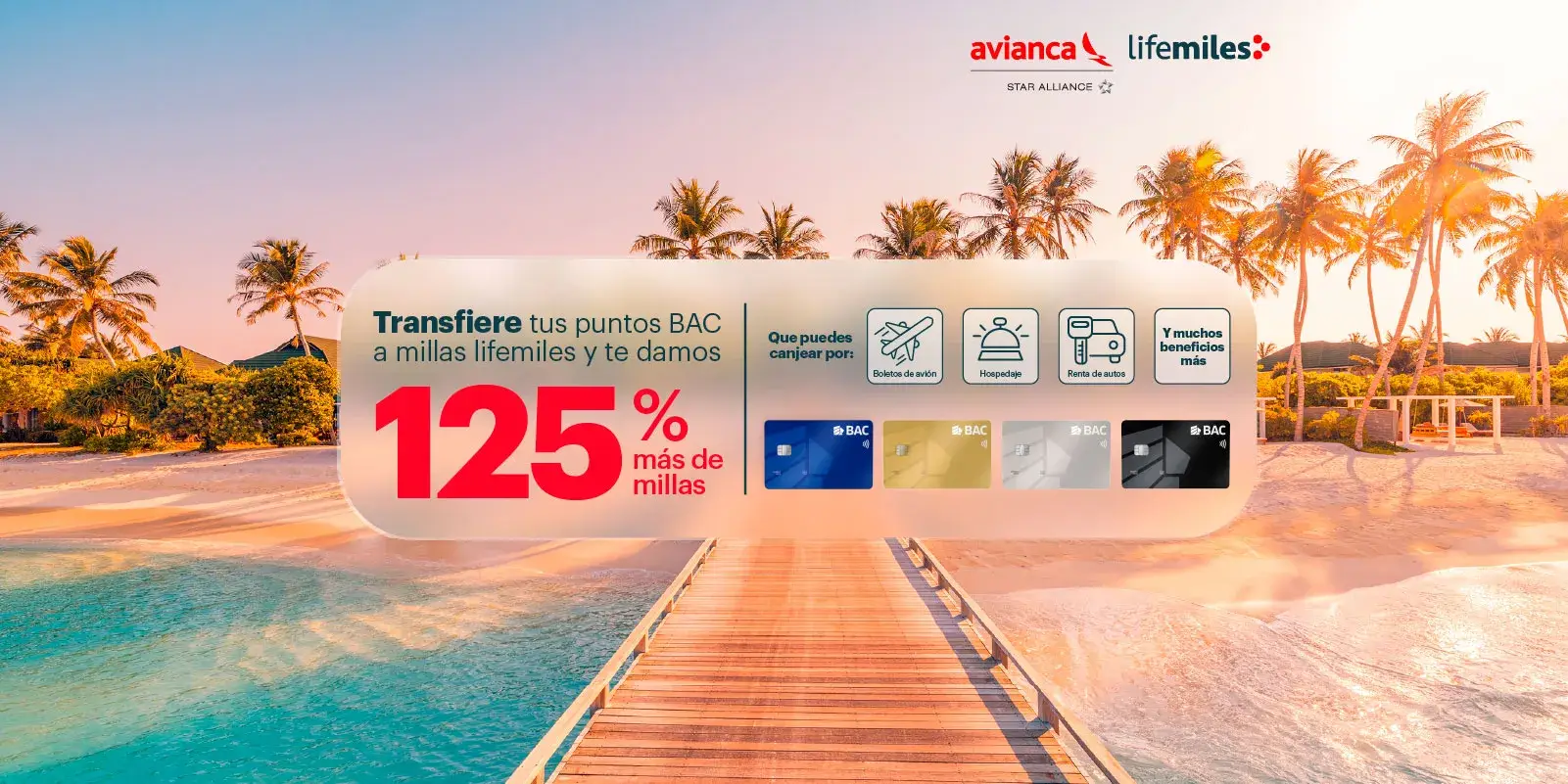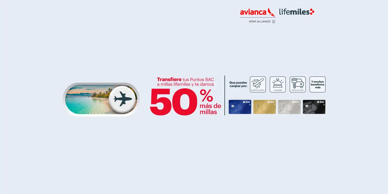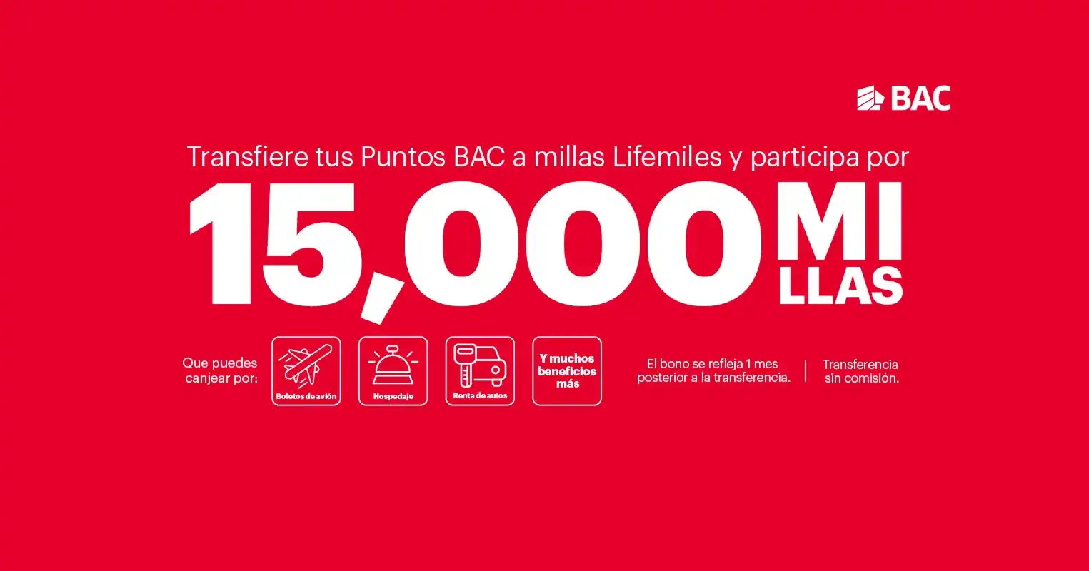 Aplican condiciones y restricciones. Esta gestión se encuentra habilitada en la banca en línea. Aplica únicamente para traslado de Puntos BAC a millas lifemiles. No aplica para tarjetas de crédito que presenten mora. El mínimo de redención es 2,000 puntos BAC, únicamente en múltiplos de mil. Cada milla lifemiles equivale a 2 Puntos BAC. El canje aplica para traslado de Puntos BAC a millas lifemiles. No aplica para tarjetas Amex del programa Membership Rewards. BAC podrá cambiar las normas y reglamentos del traslado de Puntos BAC a millas lifemiles en cualquier momento con previo aviso a través de los canales de comunicación disponibles. Ver reglamento oficial aquí.