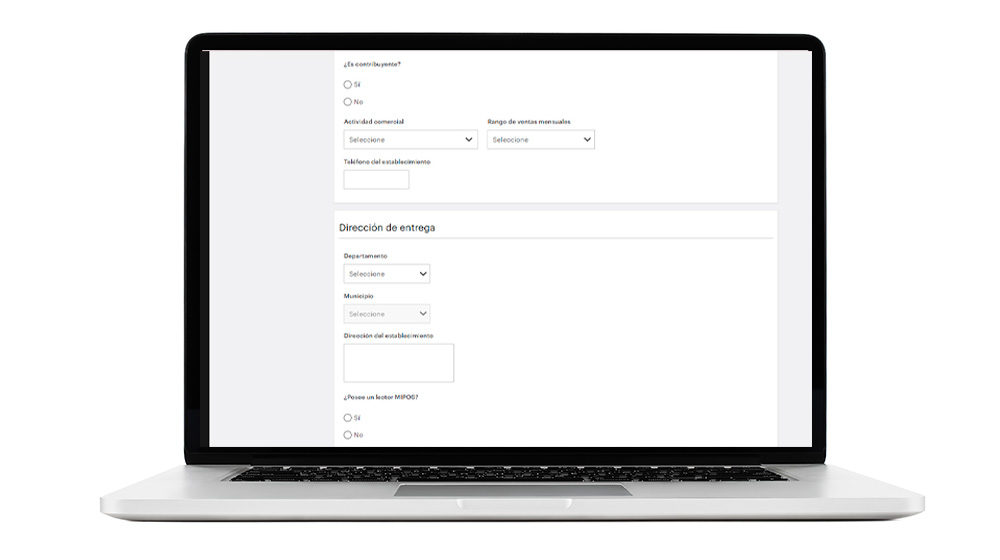 Completa los campos del formulario en el detalle de solicitud seleccionando el producto MiPOS. Haz Click en "Debe realizar el pago de afiliación en este enlace" para realizar compra del dispositivo MiPOS